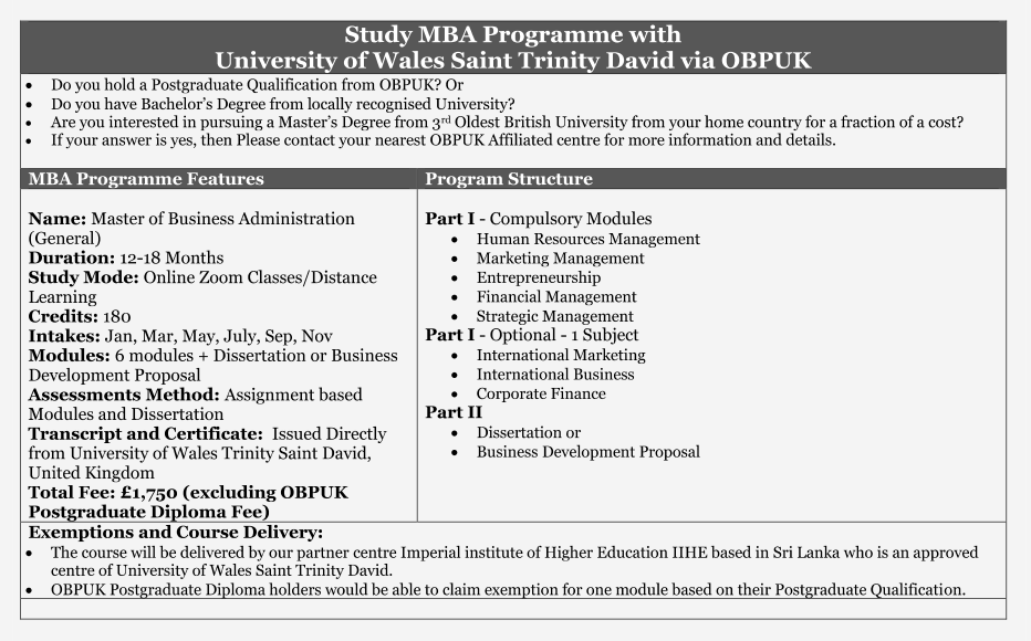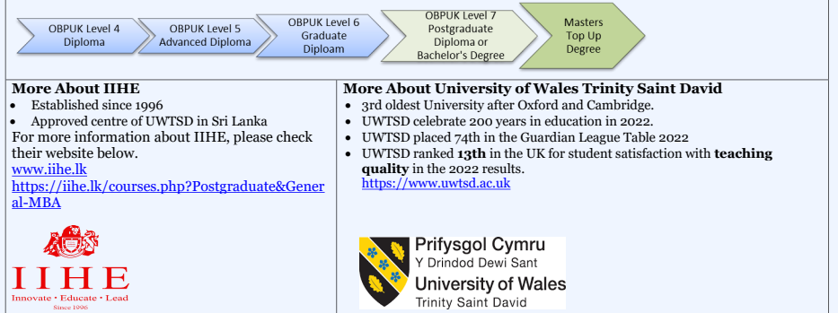 Advance from OBPUK diplomas into Bachelor’s or Master’s top-ups with recognised universities, or complete a UK MBA delivered via approved partners.